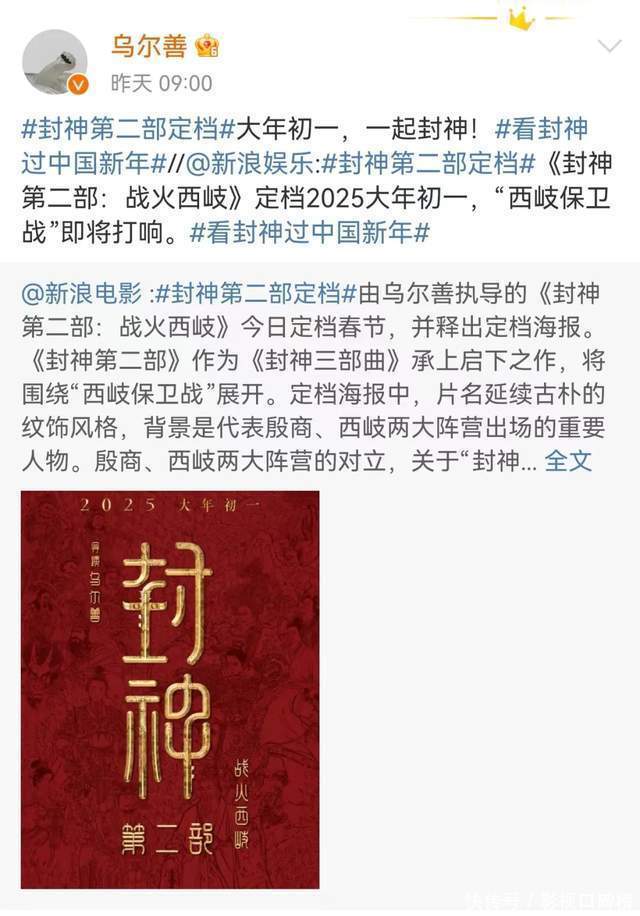 乌尔善导演发博称《封神第二部:战火西岐》定档2025年大年初一,并发布定档海报,称“西岐保卫战”即将打响亚新捕鱼,这也给不少观众吃下了一颗定心丸。
